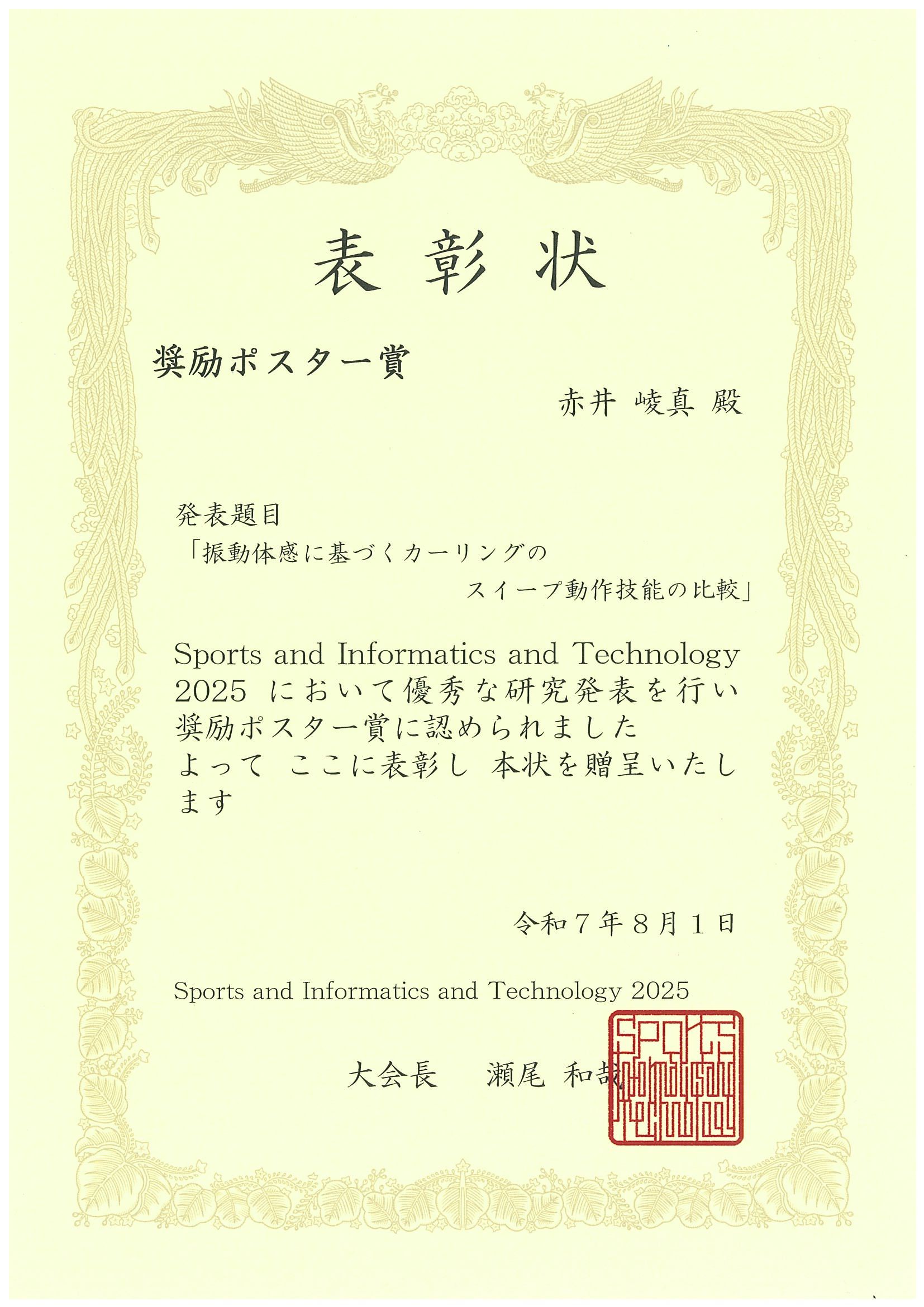 2025年7月31日~8月1日に東京ビッグサイトで開催されたSports Informatics and Technology 2025にて当研究室の赤井崚真君が奨励ポスター賞を受賞しました.